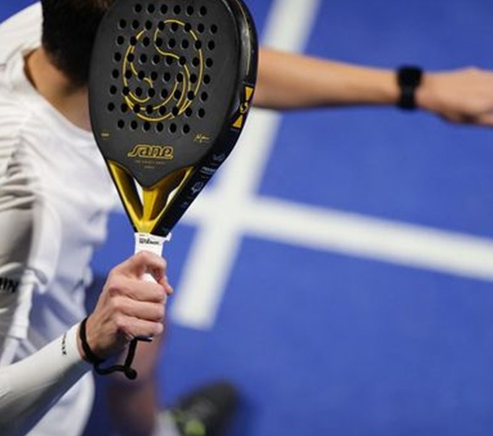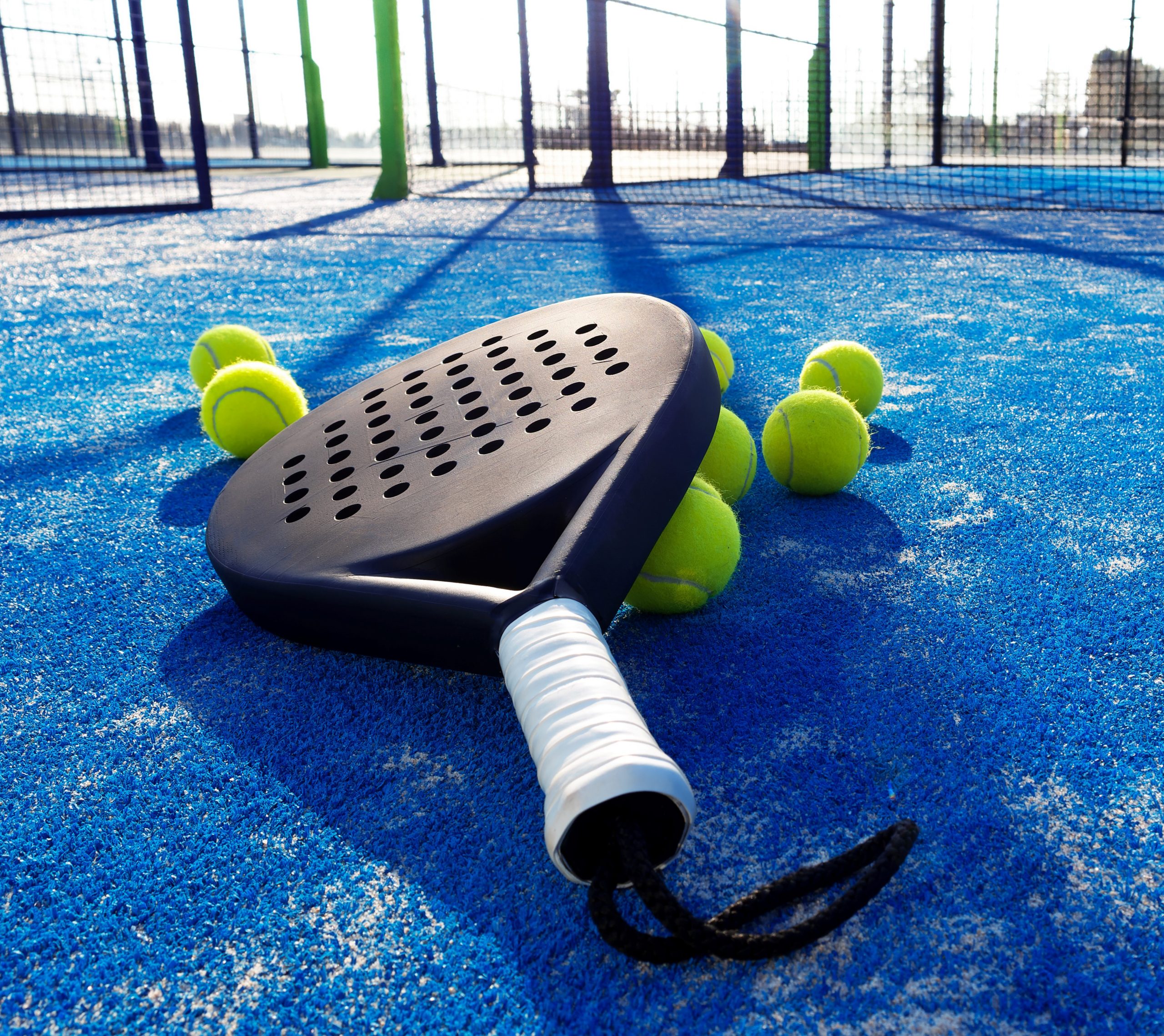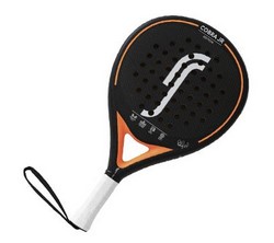 A Padel racket is similar to a tennis racket, but typically has a shorter handle and a solid hitting surface that is perforated with small holes to reduce air resistance and increase control.